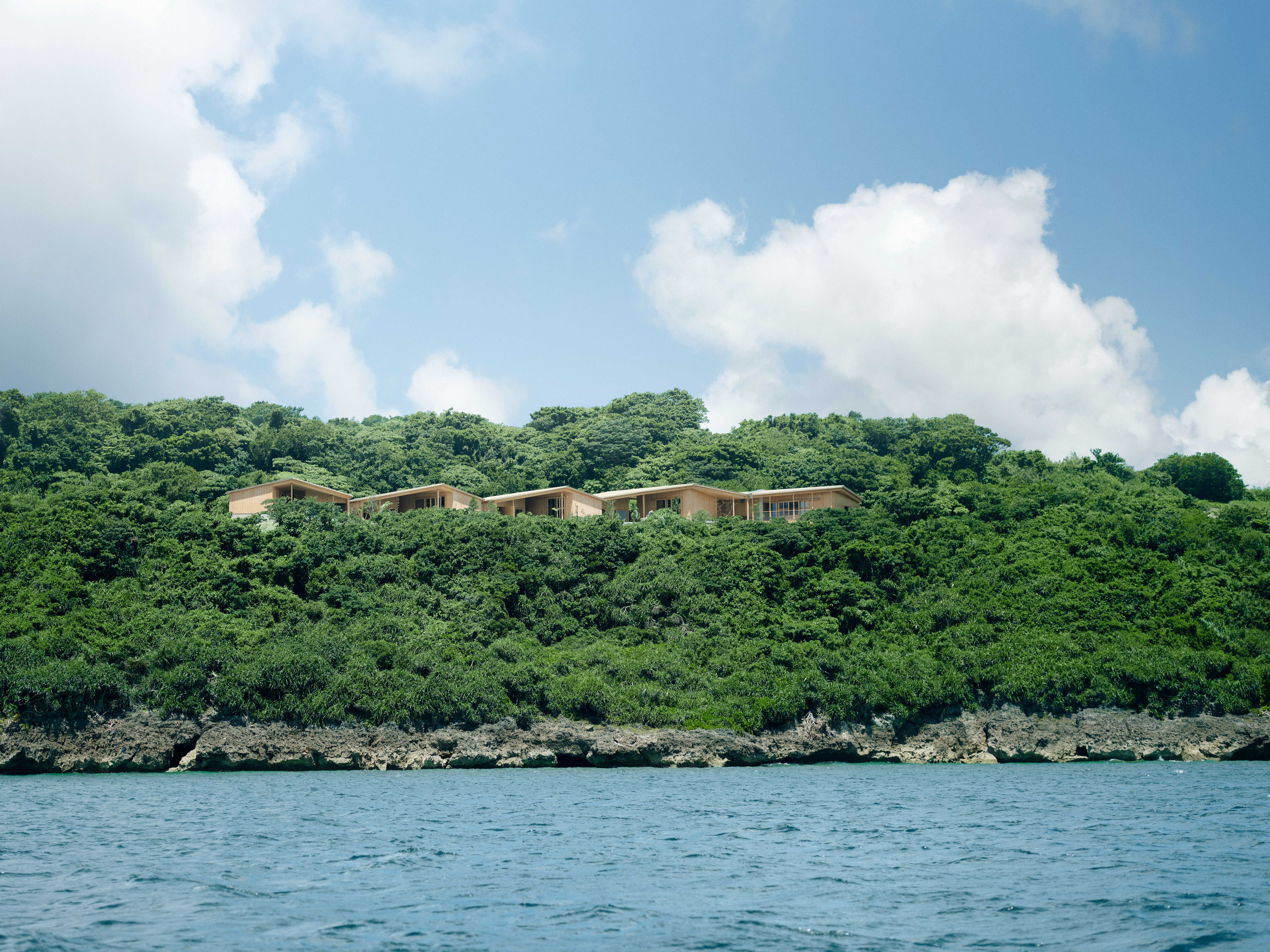 海にひらけた庭には、2つの小屋を1つの大きな屋根でつないだヴィラを置きました。小屋どうしをつなぐ軒下は、まるで大きな木陰。子どもと大人が、一度にくつろげます。